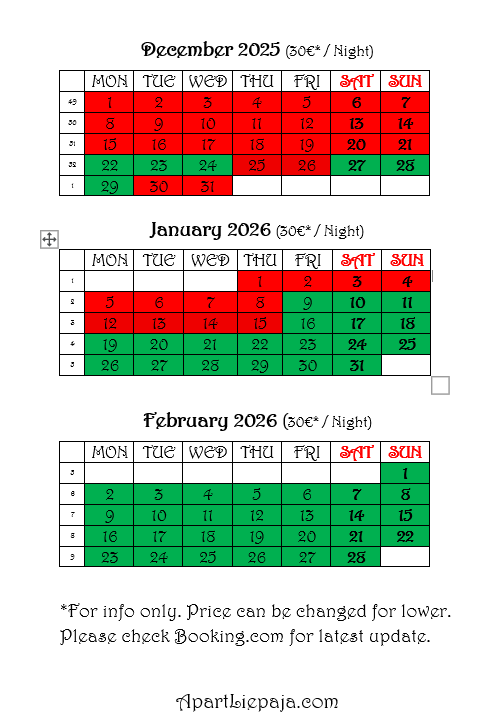 Minimums 2 naktīm; 10% atlaide 7+ naktīm. Minētās cenas var mainīties uz lielajiem pasākumiem un svētkiem.