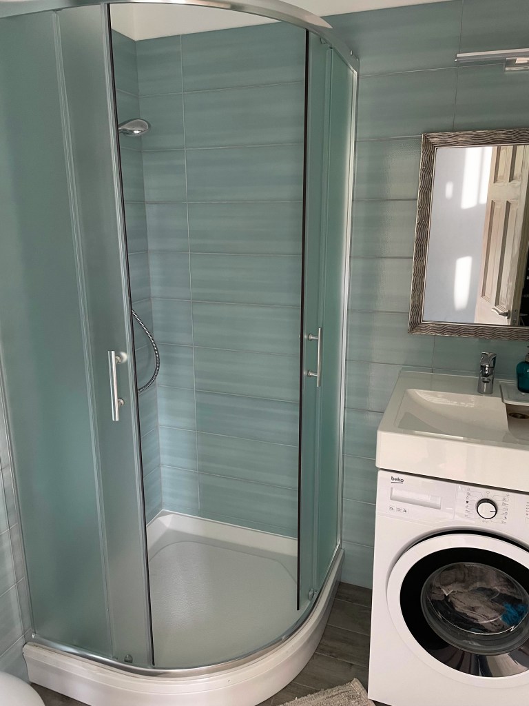 Aprīkota ar dušas kabīni, izlietni, tualeti un veļasmazgājamo mašīnu. Apsildāmā grīda Jūsu komfortam.